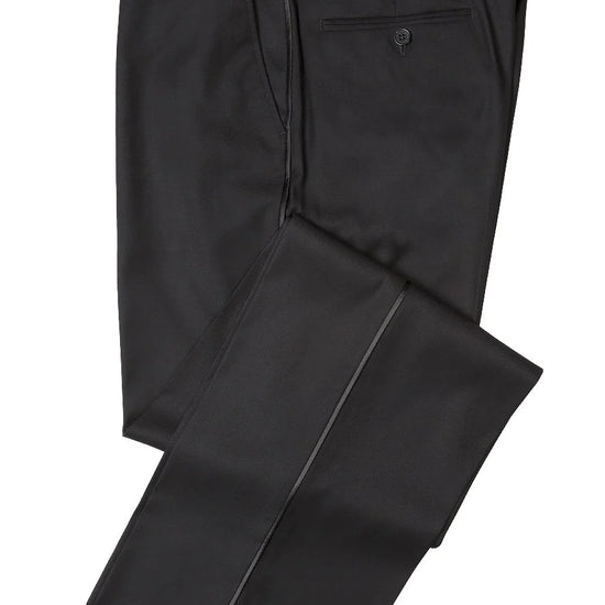 These tuxedo pants are a must-have for any man seeking a high-quality, timeless garment. These classic pants are made from a luxurious viscose blend (Super 150s), providing comfort and exuding elegance. The pants feature a plain front and a solid design, with the traditional tuxedo satin stripe running down the side of the leg.