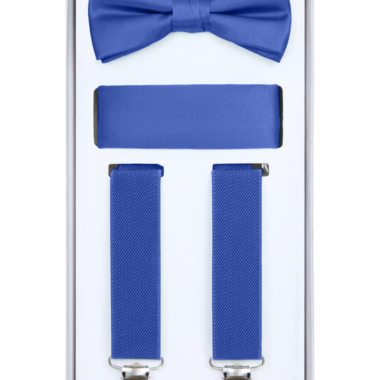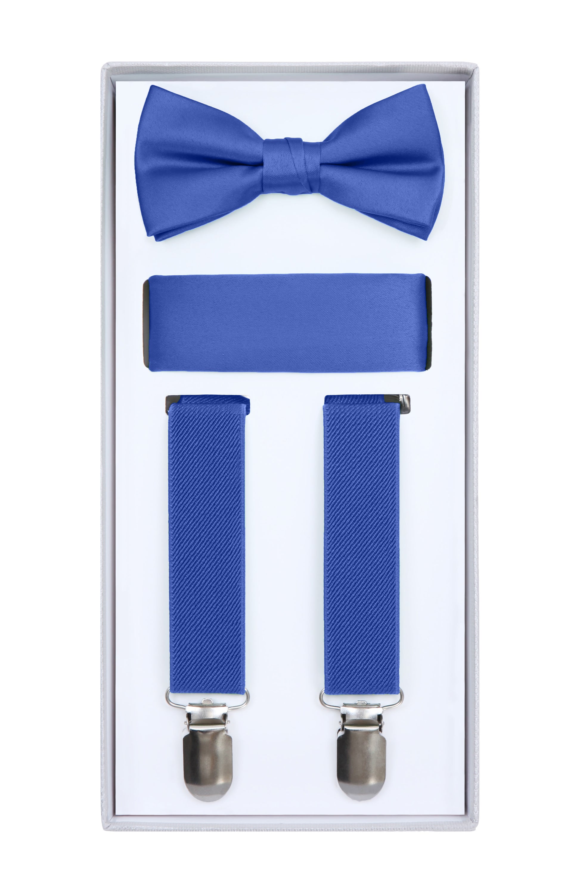 The perfect finishing touch to any formal tuxedo or dress suit. These stylish clip suspender sets come with everything you need to complete your traditional formal look. Clip suspenders, a pre-tied bow tie, and a pocket hanky are all included in this affordable, stylish set. Add a bit of color and flair to any boy's suit or tuxedo.