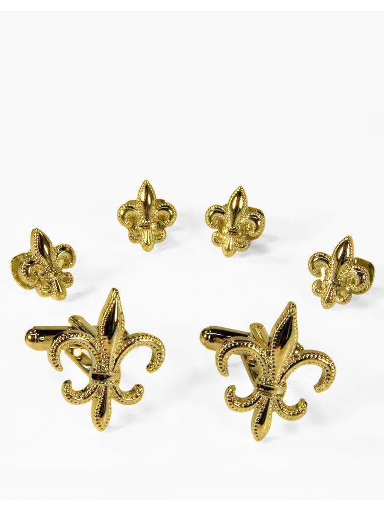 The Fleur de Lis has long been a symbol of luxury and good taste. Add these stylish Gold Fleur de Lis Cufflinks and Studs Set to your black tie outfit to make a great first impression. It's the sophisticated man who wears the fleur de lis. Long known as a symbol for the well-to-do, this sign of success can be yours. These subtle gold cufflinks are a classic touch any man can appreciate. Wear them and know you are well dressed for any occasion.