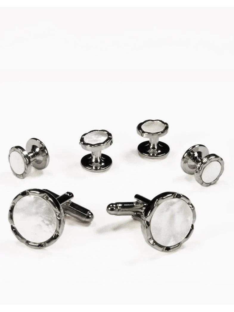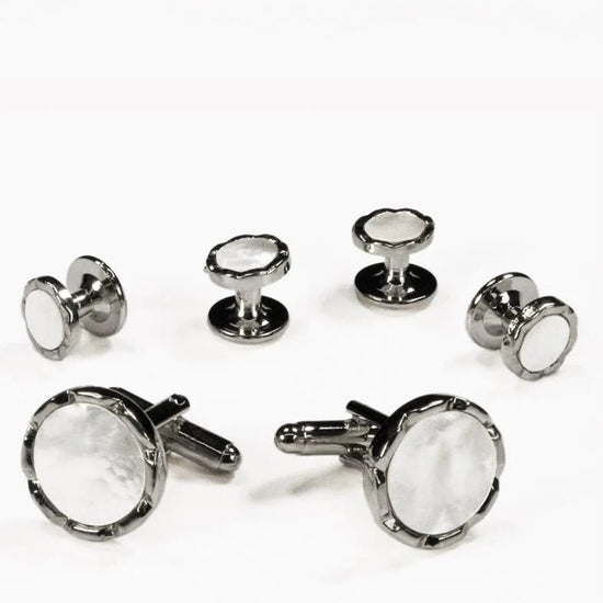 White is never more luminous than when set against black,especially when that black is sleeve of a classic tuxedo. The timeless look of mother of pearl cufflinks and studs trimmed in brushed silver is the most elegant of finishing touches. These are the formal accessories you'll come back to time and time again. A perfect compliment to any tuxedo shirt.