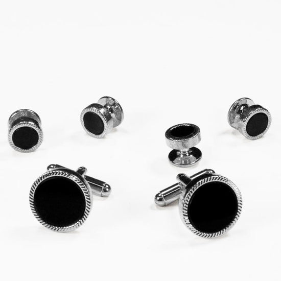 Black Circular Onyx with Silver Feather Cut Edge Studs and Cufflinks Set