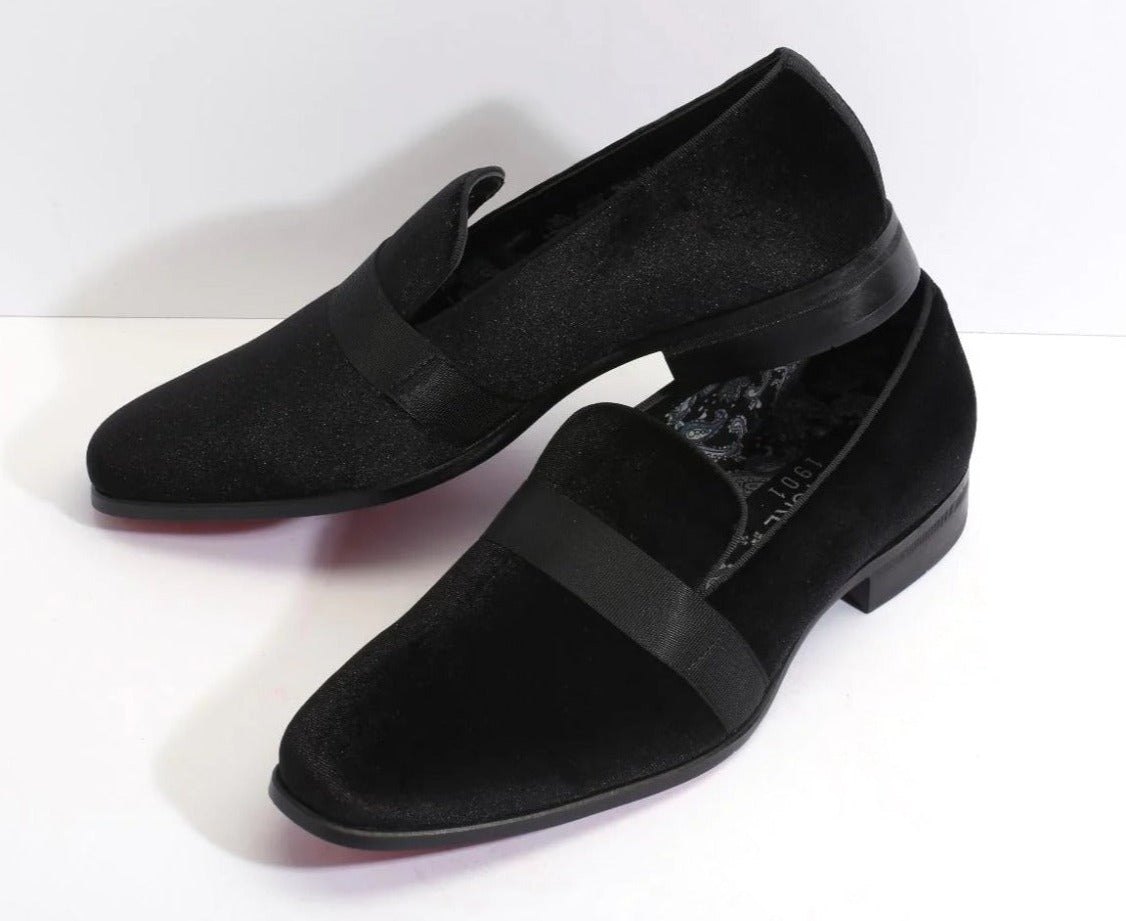 Elegant ensembles require elegant footwear. Step up your style game with these luxurious velvet slip on shoes featuring a sleek silk band. Velvet shoes are the finishing touch to your formal attire. Click the following link to view all-black formal shoes for men.